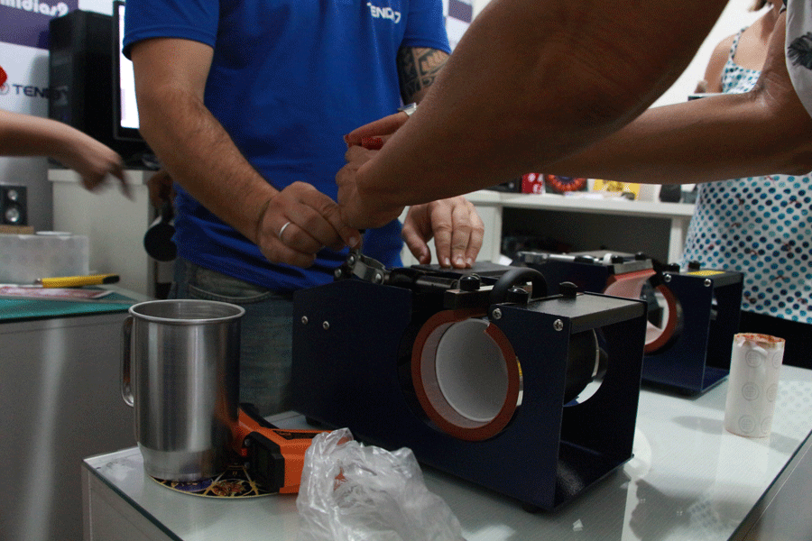 - Aula presencial: carga horária de 6 horas, de 10 às 17 horas (1 hora de almoço). Você vai aprender toda a parte teórica de um jeito bem diferente e muito didático, e a prática desde a pré impressão, criação de gabaritos, impressão e prensagem dos produtos. Na aula estampamos os principais produtos, que são a base para todos os outros: caneca de cerâmica, caneca de polímero, camisa de poliéster, azulejo e chinelo. Existe a possibilidade de estamparmos algum produto específico, caso o aluno nos informe previamente.
